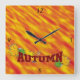 This banner spells Autumn with a color of brown. Several leaves surround the banner. An Autumn backround with colors of gold, rust and yellow finish this banner off. This is also available in a tiled design. This design is featured on assorted items through our Home & Pets and our Kitchenware Dept. This clock makes a great addition to your Autumn decor.