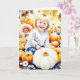 Pretty Fall watercolor picture of a little girl surrounded by pumpkins and flowers Autumn Blessings card.