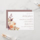 An autumn boho floral bridal shower invitation. This bridal shower invitation features an elegant fall floral arrangement. Rusty orange, terracotta, deep purple and neutral earth tones are features throughout the design. The perfect invitation for a fall wedding shower.