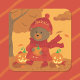 A cute kid sticker featuring the whimsical illustration of a brown bear picking up a pumpkin on a lovely autumn day . Personalise it with the child's name or remove it altogether .