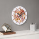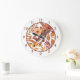 The pretty autumn browns and golds at the center of this clock are attractive and appropriate all year long. The warm tones are included in flowers, leaves, and stems. A circular matching brown frame separates the numbers from the floral images, and everything is placed on a white background.