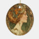 Bring timeless elegance to your holiday decor with this Autumn Cameo Ornament, inspired by the romantic beauty of the Art Nouveau era. Featuring the profile of a graceful woman adorned with autumn leaves and warm golden tones, this ornament captures the spirit of fall in exquisite detail.