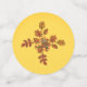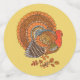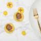 This table confetti has large golden yellow circles with a male turkey with Autumn coloured feathers and Fall leaves. Medium circle is a brighter yellow with colourful Fall leaves and small circles have a mix of golden yellows.