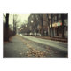 A quintessential autumnal street scene , imbued with a gentle melancholy . Fallen leaves form a rich, textured carpet across both the sidewalk and the road , their vibrant hues of red, orange, and brown hinting at the season's peak. Lining the street, mature trees stand as silent sentinels, their branches perhaps beginning to shed their final foliage, framing the view. In the background, buildings rise, their architecture suggesting a sense of history and permanence against the transient beauty of the season. Streetlights are visible, their presence a subtle promise of illumination as daylight begins to wane, or perhaps a soft glow in the early morning mist. Cars navigate the thoroughfare, their movement adding a dynamic element to the otherwise still scene, their headlights or taillights perhaps catching the diffused light. The overall atmosphere is one of quiet contemplation , a moment suspended in time where the beauty of nature's cycle is on full display, evoking a feeling of nostalgia and the peaceful acceptance of change.