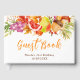 This fun and whimsical birthday party guest book features watercolor pomegranate, apples, grapes, mushrooms and foliage on a gold geometric frame. The text combines handwritten script and serif fonts for a stylish and modern look. This is perfect for a rustic autumn fall birthday party.