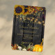 Rustic autumn harvest, sunflowers, fall botanical flowers, and pumpkin wedding invitation on a dark brown barn wood like background.