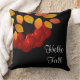 This throw pillow is shown in a autumn fall foliage print with a black background colour.