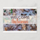 Welcome autumn postcard with a beautiful picture of fallen leaves with tiny yellow mushrooms.