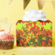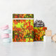 Fiery orange and gold leaves set against a vivid green background creates an abstract autumnal pattern on this bright wrapping paper.