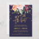 This autumn floral we tied the knot elopement reception card is perfect for a fall post elopement party. The design features a stunning bouquet of blush, orange peach, and marsala burgundy flowers with faux gold foil typography and confetti. The backing features a coordinating flower arrangement with gorgeous wedding typography. RSVP cards are sold separately.