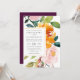 An elegant fall wedding invitation with autumn floral in fall colours. The autumn watercolor floral wedding invite features a large floral bouquet of gold and blush pink roses. The unique design places the wedding details along the left side of the invitation. Personalise the rustic invitation using the template provided. Matching RSVPs and other wedding stationery in our "Autumn Elegance" wedding collection.