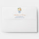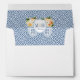 Return Address envelope design. The liner features a dark blue and white Greek Key print and a couples monogram crest, with a classic ginger jar filled with flowers in fall colours on each side. The reverse flap has the name/ return address in pumpkin orange and navy blue, complemented by the same vase with flowers that is on the liner.