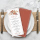 This wedding reception menu card features a stunning combination of autumn flowers and leaves in terracotta and beige hues that adorn the upper part of the front, surrounded by a white border for a truly classic look. On the back of the card, guests will find another beautiful bouquet of fall flowers, this time on a terracotta clay background, framed by a white border to complete the picture. This menu card is sure to add a touch of elegance and beauty to any wedding reception. The cover has been designed using some assets from Freepik.com