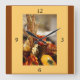 Designed with a picture of an Autumn floral arrangement. This arrangement was displayed in the colors of oranges, reds, yellows and browns. The arrangement has flowers, pumpkins, and dried leaves. This picture was a close up that featured the Autumn months. A brown border was added. This clock is available in square or round.