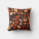 This charming throw pillow showcases a vibrant autumn-inspired design. The pattern features a variety of stylised leaves in warm fall colours – rich reds, deep oranges, golden yellows, and muted browns – set against a dark chocolate background. The leaves are arranged in a flowing, organic pattern that suggests gentle movement, as if caught in an autumn breeze. This pillow brings the cosy essence of fall into any living space, perfect for adding a seasonal touch to sofas, chairs, or beds.