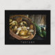 Postcard of a still life composition of autumn food vegetable ingredients like porcini mushrooms, courgettes and pumpkin with a black border and the text: 'Tuscany'.