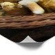 Poster print of a still life composition of autumn food vegetable ingredients like porcini mushrooms, courgettes and pumpkin.