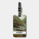A luggage tag with a nature photograph. Moody and beautiful landscape. A secluded stone bridge beside a lively river with a forest and mountains surrounding the area.