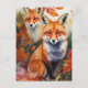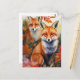 This seasonal postcard features watercolor art of two foxes in a forest in autumn. The coats of the woodland creatures are complemented by the warm colours of fall in a colour scheme of oranges and deep reds.
