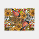 Hand-drawn autumn pattern featuring bullfinches, dahlia and chrysanthemum flowers, various berries, leaves and bugs