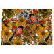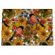 Hand-drawn autumn pattern featuring bullfinches, dahlia and chrysanthemum flowers, various berries, leaves and bugs