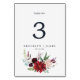 This autumn garden burgundy table number is perfect for a fall wedding. The floral design features stunning blush pink, red, navy and burgundy watercolor flowers, blossoms and green leaves arranged in a lively fall wreath/bouquet. The card prints on the front and back (double-sided). Add each table number that you need to your cart individually.