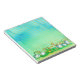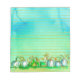A lined notepad for the autumn season featuring white ghost pumpkins and pears drawn with ink and painted with watercolor on a blue, green, and yellow watercolor wash background.
