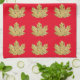A gold metallic look maple leaf on a red background. Perfect for fall or winter home decor.