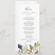 This autumn greenery wedding dinner menu card is perfect for a fall wedding. The modern rustic design features navy blue, sage green and gold leaves with sprigs of dark blue flowers. This menu can be used for a wedding reception, rehearsal dinner, or any event.