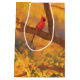 In a vivid yellow maple a male cardinal perches, keeping watch over his mate on the nearby bird feeder.