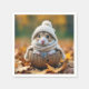 A cute hamster is snugly wrapped in a knitted hat and scarf, sitting in a walnut shell surrounded by autumn leaves