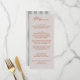 A colourful retro funky modern mist and light green and burnt orange hand written menu . And hand drawn light green pinstripes on the back . Perfect and matching with the whole suite. wedding dinner menu. Which features chic template design of boho vintage fall mist background and burnt orange typography.