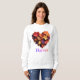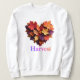 Whimsical autumn design featuring a heart made of colorful fall leaves. The word "Harvest" below it. Perfect for cozy season.