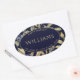 The Autumn Harvest Gold Leaves & Berries Oval Sticker design features autumn leaves in shades of gold, yellow and green mixed together with inky blueberries on a classic indigo navy blue background. Customise the text to send seasons greetings to friends & family!
