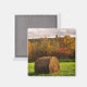 This fine art photography magnet presents a lovely autumn landscape in seasonal fall foliage colours of red, orange, yellow, brown and green. A storm has passed and the sun is breaking through the clouds onto a mown field with round bales of hay.