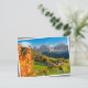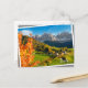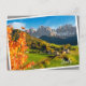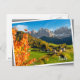 Postcard of a church and the village St. Magdalena in Villnoess in a fairy tale landscape with majestic Dolomites mountains in the background and leaves in autumn colours in Val di Funes valley in Italy with the text: 'Italy'. The card is a bit rotated to create the effect like it is laying loose.