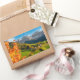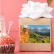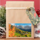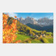 Rectangular photo sticker of a church and the village St. Magdalena in Villnoess in a fairy tale landscape with majestic Dolomites mountains in the background and leaves in autumn colours in Val di Funes valley in Italy.