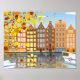 Amsterdam city view (canal, houses, boats and a branch of the autumn tree with falling leaves). Autumn colour theme: yellow, orange, brown, blue.