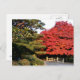 Red pine tree contrasts with a large scarlet Japanese maple over a small bridge