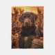Embrace the rustic charm of Autumn with our stunning blanket showcasing an adorable Chocolate Labrador Retriever pup in a harvest field as the sun sets in the background.