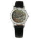A watch with a nature photograph. Moody and beautiful landscape. A secluded stone bridge beside a lively river with waterfalls, forest and mountains surrounding the area.