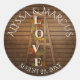 Rustic barn wood and vintage wood ladder with colourful fall leaves and "Love" letters design over dark barn wood, wedding favour sticker with bride and groom's names and wedding.
