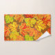 Seamless block pattern of stylised fall leaves in brown, red, orange, yellow, and green.