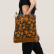 Beautiful tote bag featuring a seamless pattern of orange and brown autumn leaves on a dark background. A small rectangle is placed towards the top of the bag with a template to add your name to personalise.