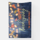 This customisable Thanksgiving banner is the perfect way to spread holiday cheer and warmth. A blend of autumn leaves in warm tones graces a blue wooden backdrop. Zigzagging warm white fairy lights add magic. "Thanksgiving" in elegant cursive centres the design, while below, a serif font accommodates your family name or message. Embrace the joy of a heartfelt celebration. 🍁🦃