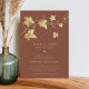 Fall in love with these modern and minimal invitations for autumn baby showers. Clean, minimalist design features a warm terracotta background graced with watercolor leaves in fall colours. "Fall in Love with baby [Name}" appears beneath, along with your baby shower details. Gold foil lettering and accents add luxe appeal to this beautiful fall baby shower invitation.