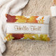 Autumn leaves throw pillow shown in white with a artful autumn leaves print. Text: Hello Fall