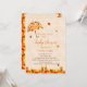 A perfect invitation for an Autumn themed baby shower with an umbrella made of fall coloured leaves against a tan background. There is a bottom border of colourful Autumn leaves and the back features the leaves on both sides.