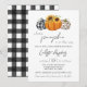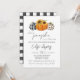 A little pumpkin is on the way! Celebrate the expectant mum with a fall themed baby shower invite. Three cute pumpkins in black and white gingham and leopard print add a bit of whimsy and rustic charm to the invitation. Sunflowers adorn the centre orange pumpkin. The back features a black and white plaid print. All details can be customised. This is the perfect gender neutral autumn baby shower invitation.