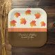 Paper plates for an autumn wedding featuring brilliantly coloured maple leaves, a plaid ribbon, and a brown background. A seasonal way to serve cake at the reception. Include the bride and groom's names and wedding date.